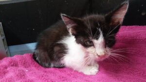 George was found in the middle of the street weighing less than a pound and dehidrated and hours from death. We immediately began feeding him Kitten Meal Replacement. For several days all he could do was eat and sleep. In less than a week he began easting solid food. He has a small scratch on his right eye that makes it appear clouded but his eyesight is unaffected.