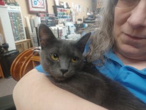 Maeve was abandoned by her mother and began human care very early. She is VERY comfortable around people. She is as Gray as graphite full of play. Maeve is also shop cat but will be seeker her fur-ever home soon.